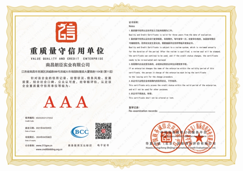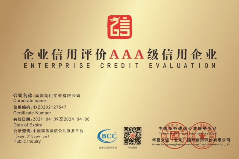 南昌朗臣實業授予企業信用評級“AAA”級,央行備(bèi)案編(biān)号:10019